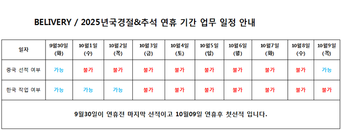 2025년 국경절&추석연휴기간 업무일정을 안내 해드립니다.